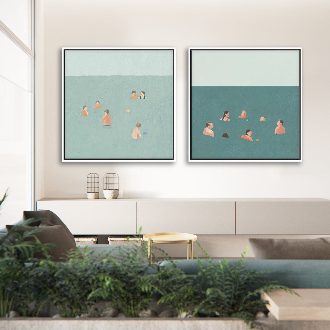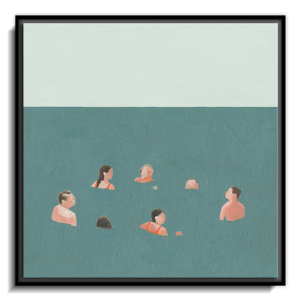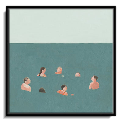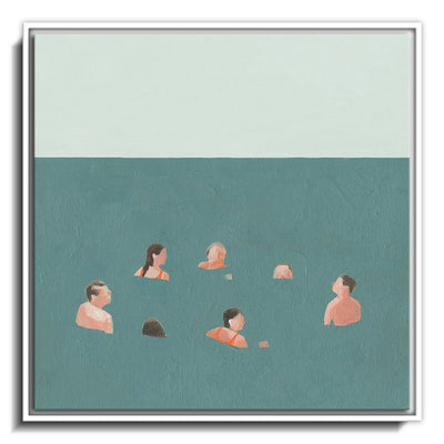 The canvas is wrapped and stretched similar to a gallery wrap and then mounted inside a wooden frame, leaving a small "gap", to create the illusion that the canvas is floating within the frame.