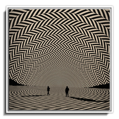 The canvas is wrapped and stretched similar to a gallery wrap and then mounted inside a wooden frame, leaving a small "gap", to create the illusion that the canvas is floating within the frame.