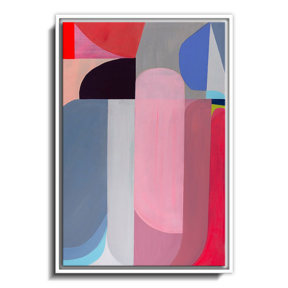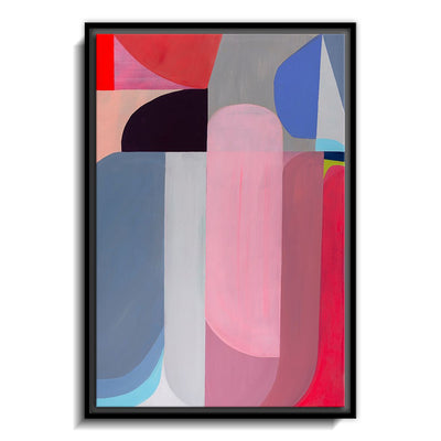 The canvas is wrapped and stretched similar to a gallery wrap and then mounted inside a wooden frame, leaving a small "gap", to create the illusion that the canvas is floating within the frame.