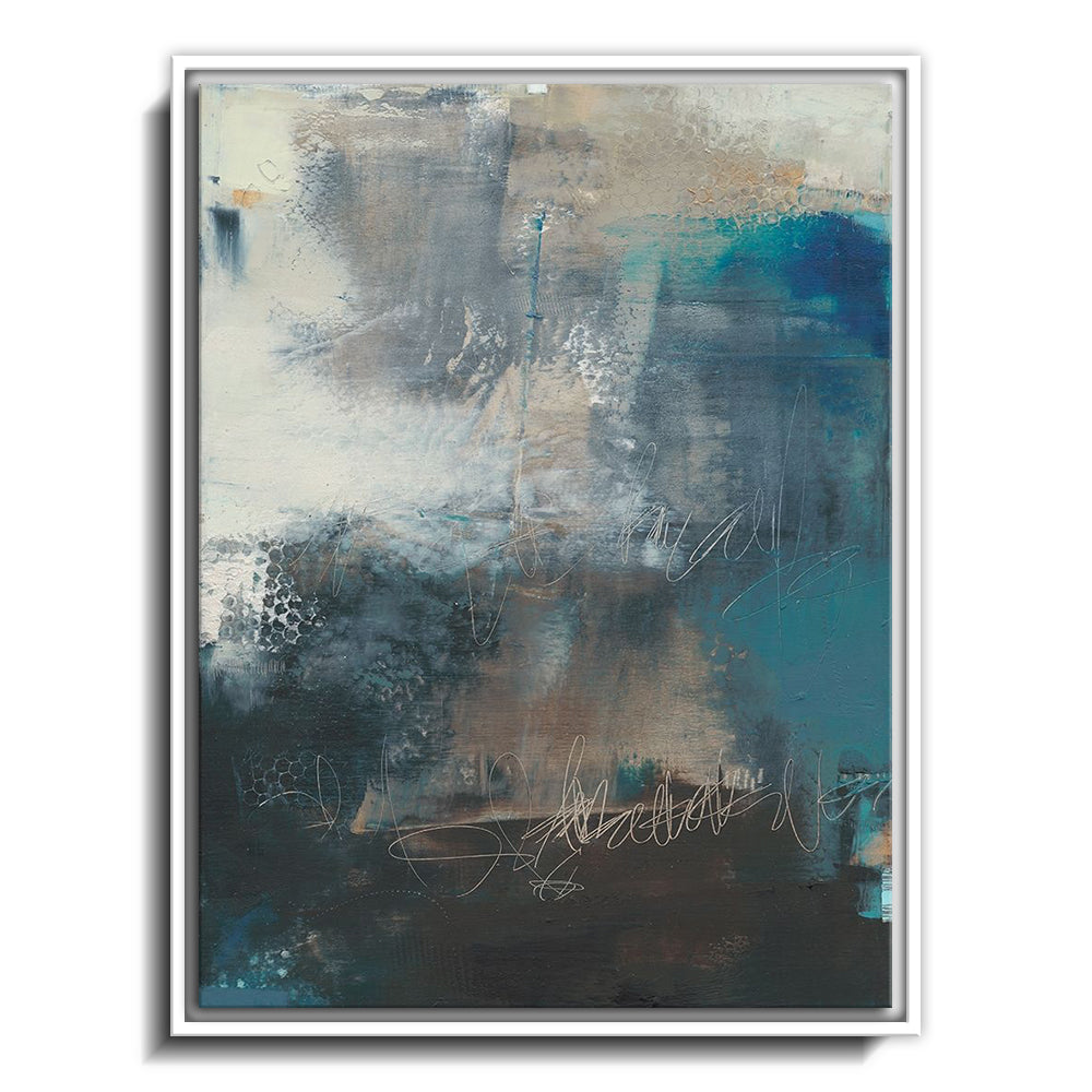 The canvas is wrapped and stretched similar to a gallery wrap and then mounted inside a wooden frame, leaving a small "gap", to create the illusion that the canvas is floating within the frame.
