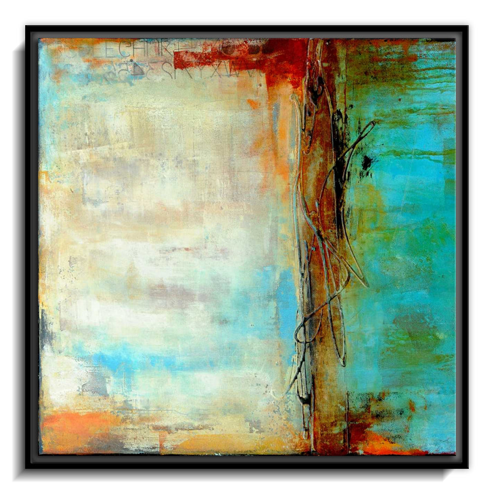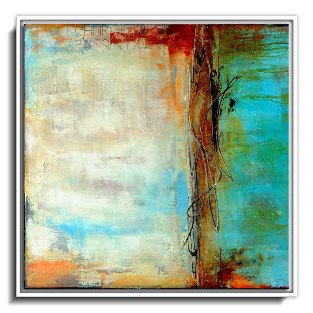 The canvas is wrapped and stretched similar to a gallery wrap and then mounted inside a wooden frame, leaving a small "gap", to create the illusion that the canvas is floating within the frame.