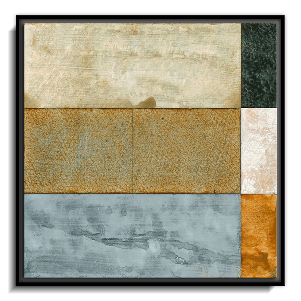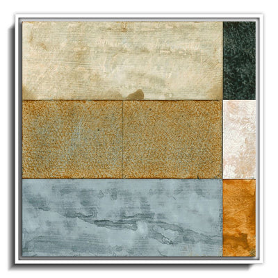 The canvas is wrapped and stretched similar to a gallery wrap and then mounted inside a wooden frame, leaving a small "gap", to create the illusion that the canvas is floating within the frame.