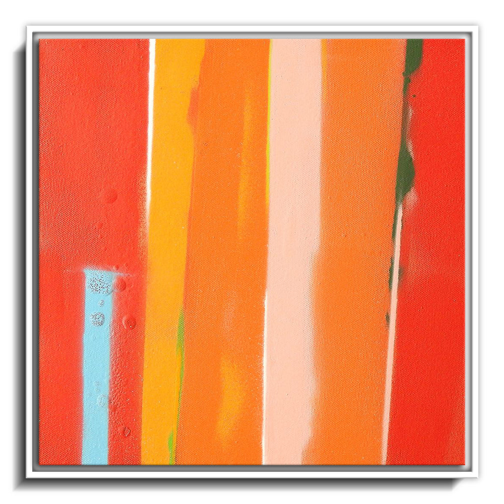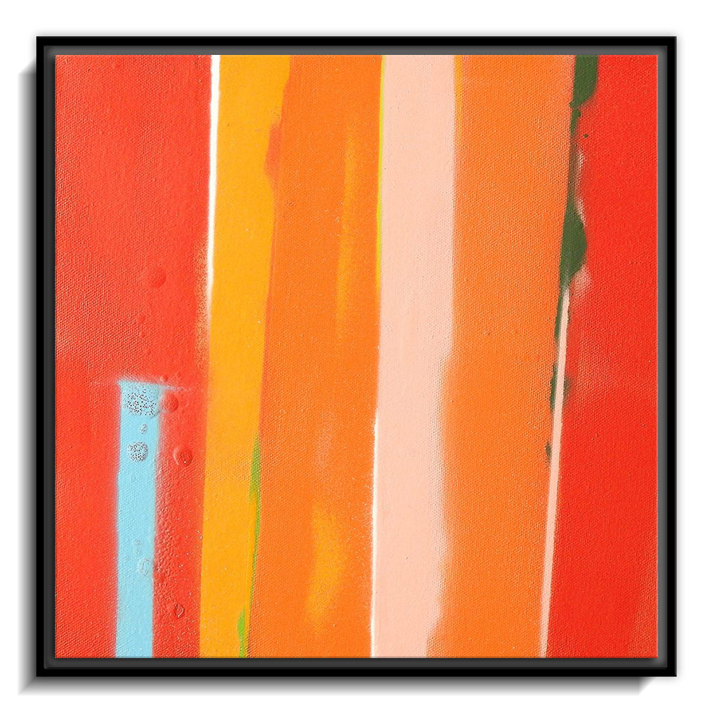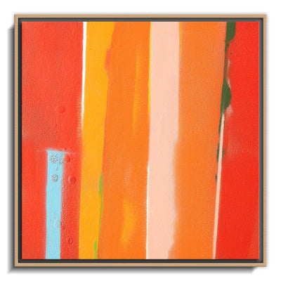 The canvas is wrapped and stretched similar to a gallery wrap and then mounted inside a wooden frame, leaving a small "gap", to create the illusion that the canvas is floating within the frame.