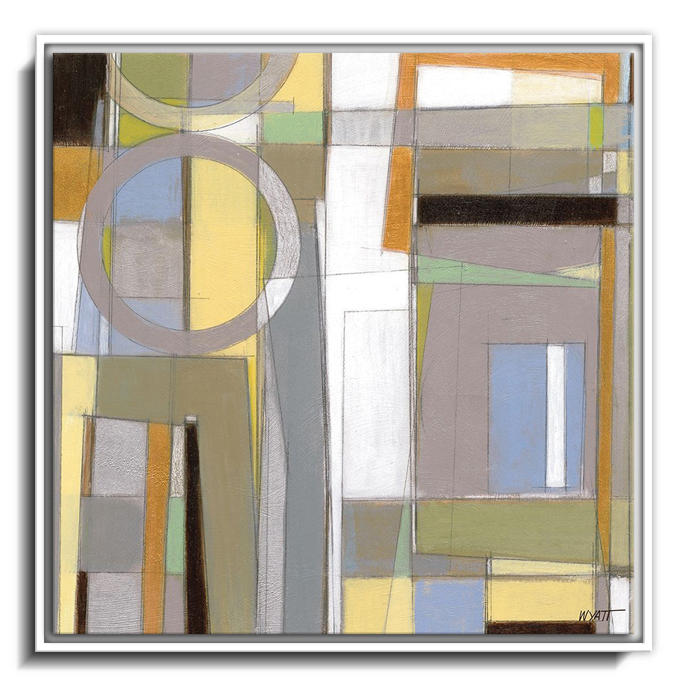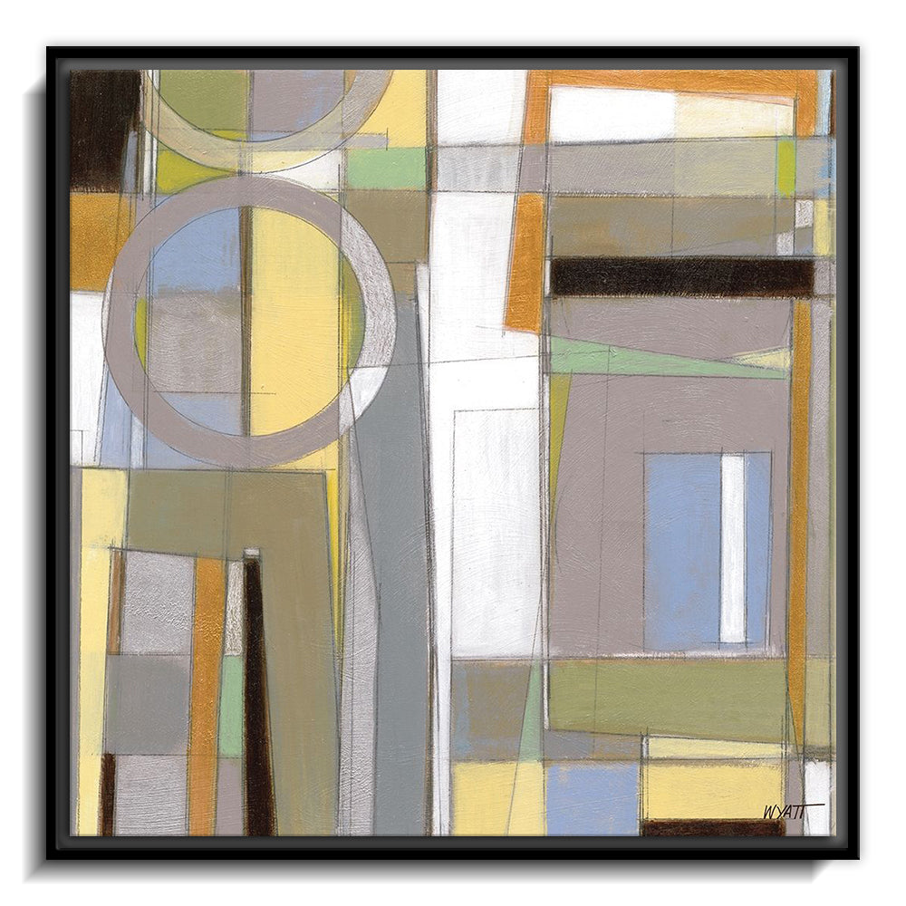 The canvas is wrapped and stretched similar to a gallery wrap and then mounted inside a wooden frame, leaving a small "gap", to create the illusion that the canvas is floating within the frame.