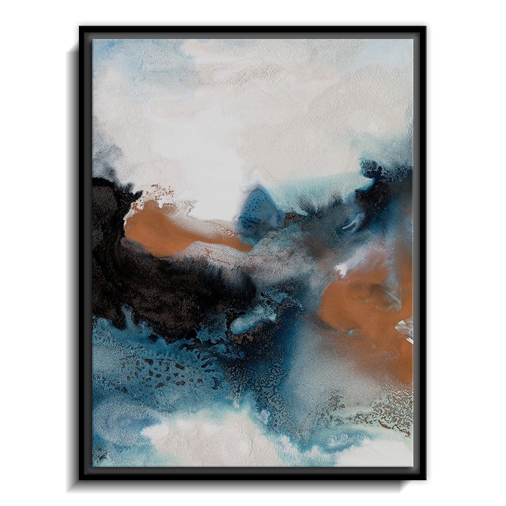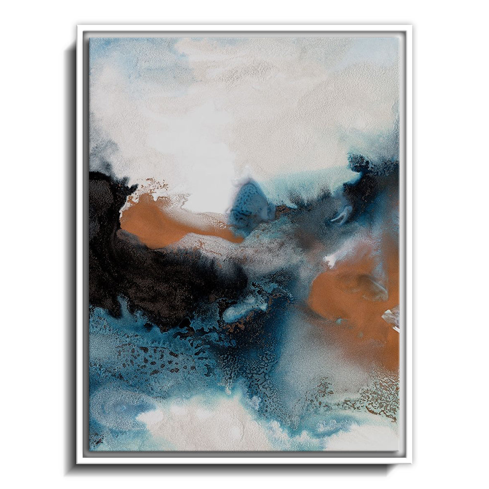 The canvas is wrapped and stretched similar to a gallery wrap and then mounted inside a wooden frame, leaving a small "gap", to create the illusion that the canvas is floating within the frame.