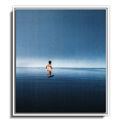 The canvas is wrapped and stretched similar to a gallery wrap and then mounted inside a wooden frame, leaving a small "gap", to create the illusion that the canvas is floating within the frame.