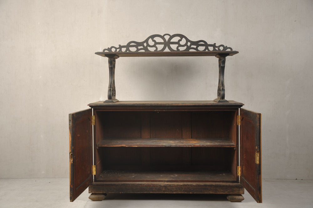 DESCRIPTION A Two Tier Dumb Waiter (dining room sideboard) with fretwork along the back of the shelf above. The shelf top is raised on two elegantly shaped pierced supports. There is a double shuttered storage below with a plinth resting on four soap dish shaped feet. The design of this piece has great balance. The heavy base works very well with the light fretwork on top.