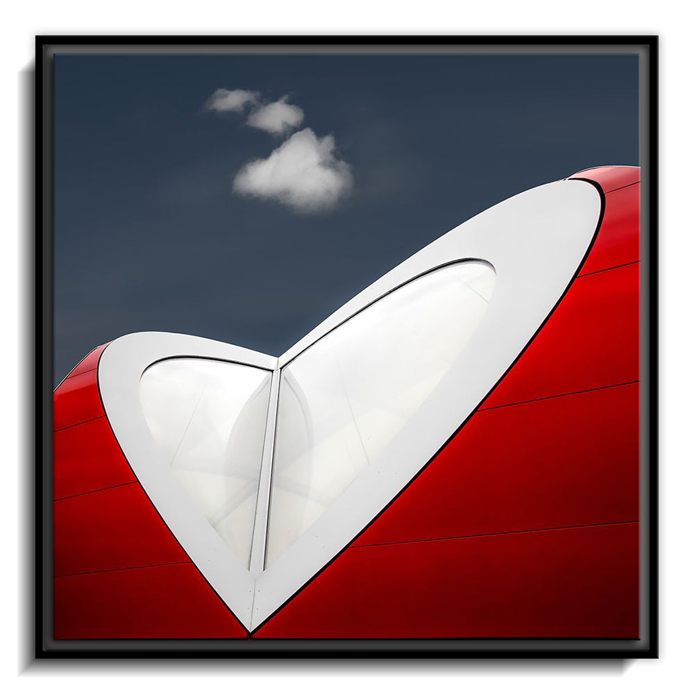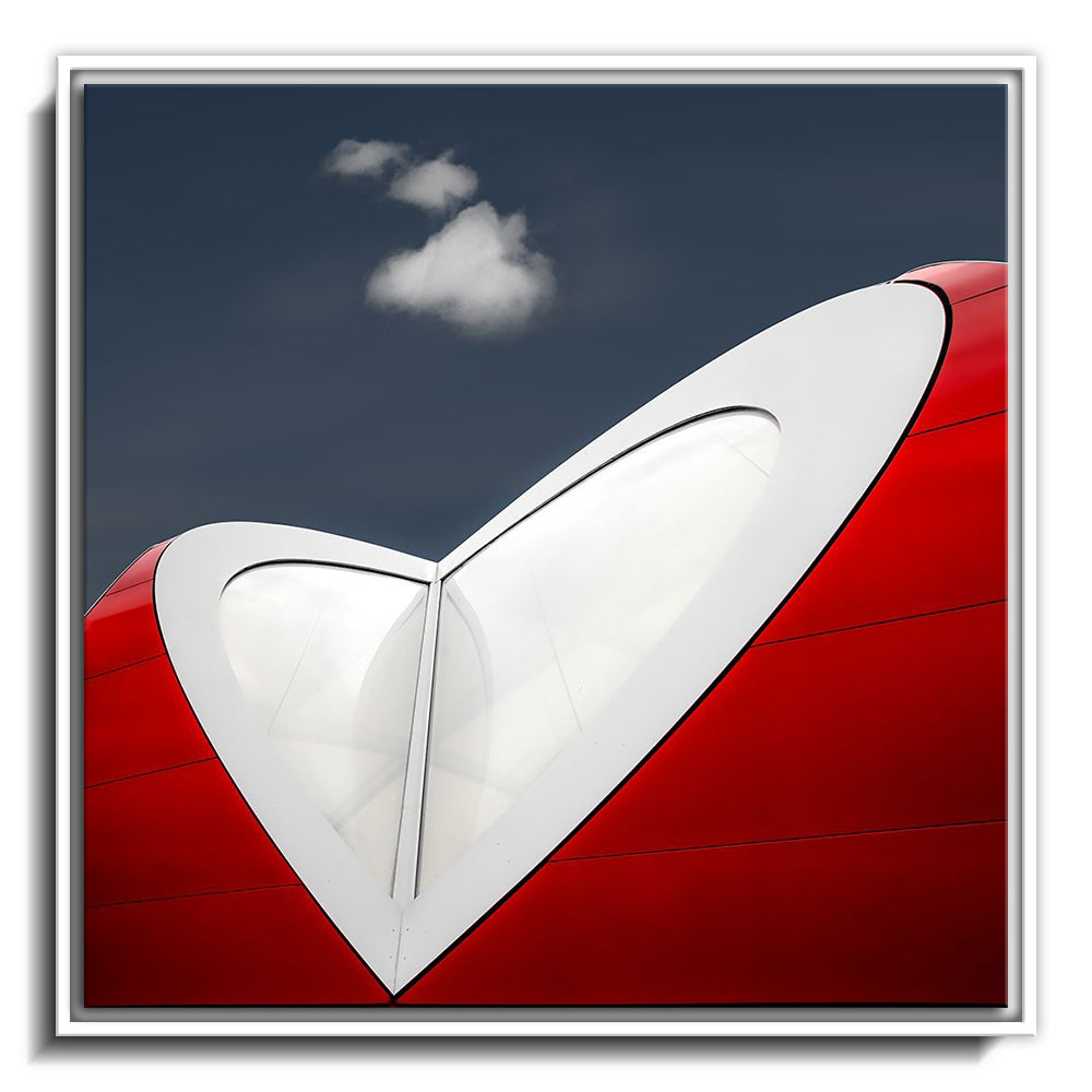The canvas is wrapped and stretched similar to a gallery wrap and then mounted inside a wooden frame, leaving a small "gap", to create the illusion that the canvas is floating within the frame.